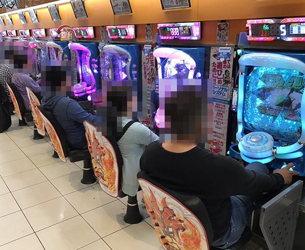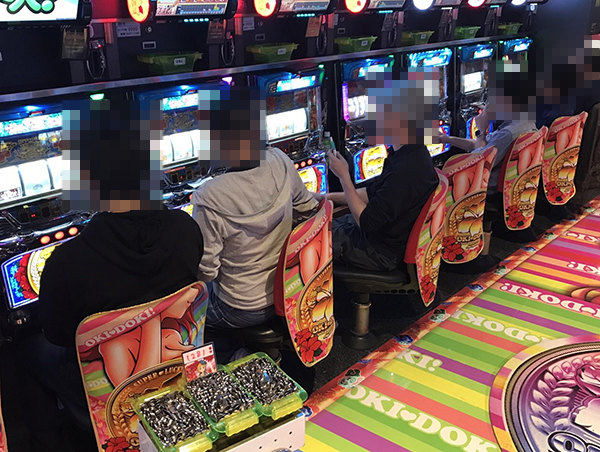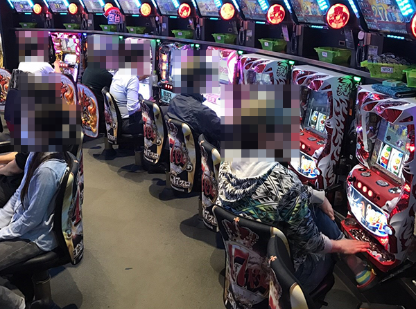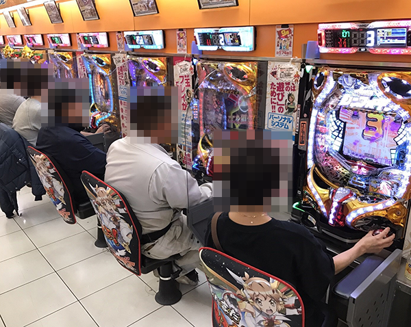 4円パチンコでは、「CRフィーバー戦姫絶唱シンフォギア」や新台の「CR翠星のガルガンティア」が盛況。うれしそうな表情でハンドルを握る姿からは、充実した時間を過ごせていることがうかがえた。
