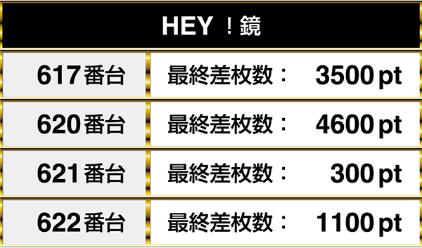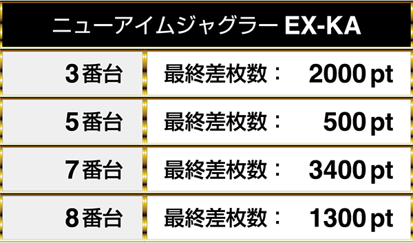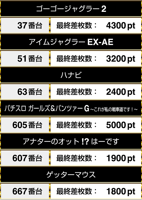 『ゴーゴージャグラー2』の37番台と『アイムジャグラーEX-AE』の51番台はどちらも3000ptを上回ってこの日を終えていた。