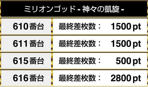 おなじく、6台設置の『ミリオンゴッド-神々の凱旋-』も4台がプラスptを記録した。