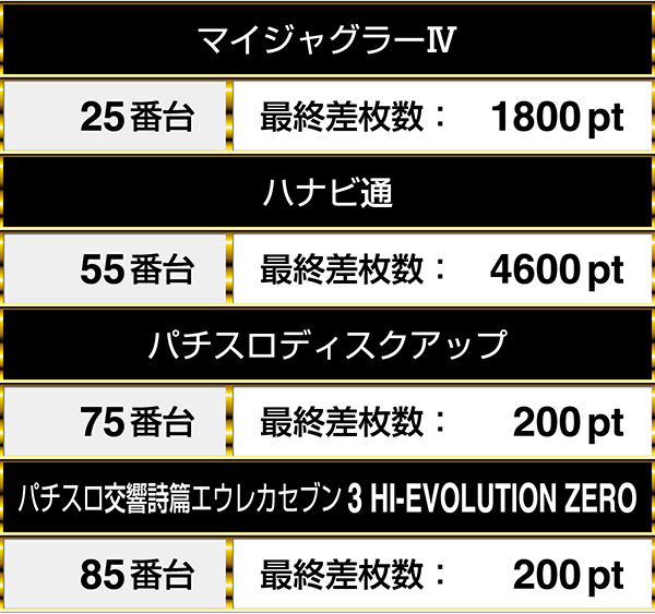 『パチスロディスクアップ』の75番台と『パチスロ交響詩篇エウレカセブン3 HI-EVOLUTION ZERO』の85番台もプラスptを記録してこの日を終えていた。