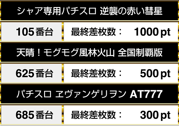 625番台の『天晴!モグモグ風林火山 全国制覇版』や『パチスロ ヱヴァンゲリヲン AT777』の685番台もプラスpt!!