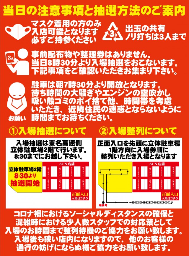 特に混雑が予想される日はあらかじめ抽選入場をお知らせする場合があります。その他入場ルールにつきましては店内にてご確認ください。 |