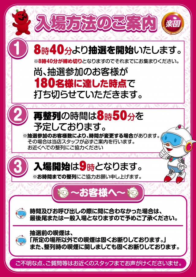 | ルール詳細 | 抽選会は8時40分より開始いたします。再整列は8時55分に行います。 |
