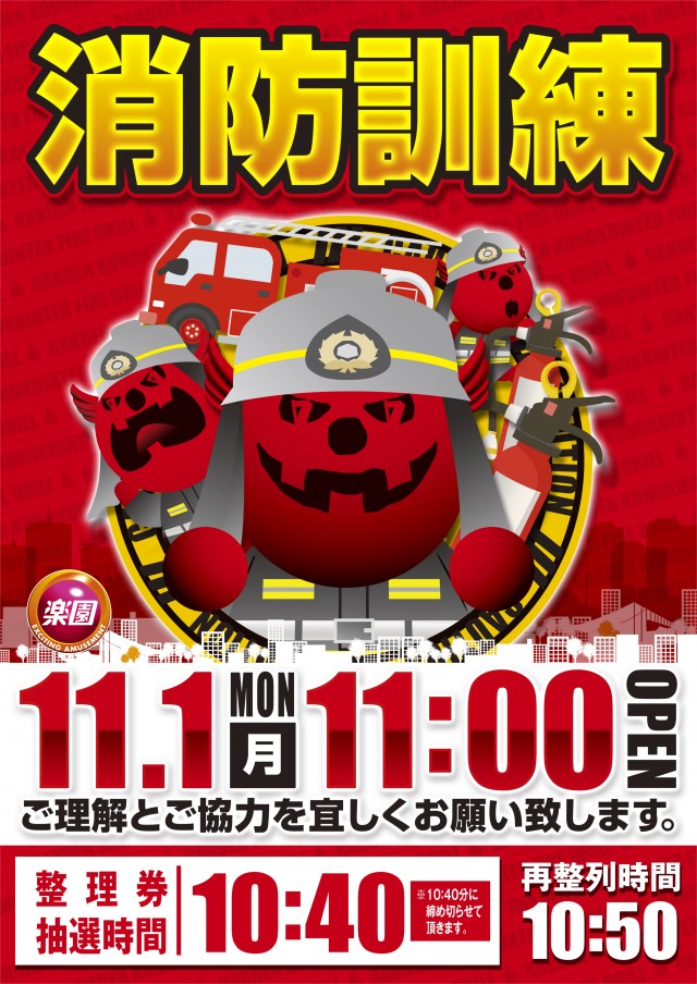 11月1日(月) 消防訓練実施に伴い11時開店となります。