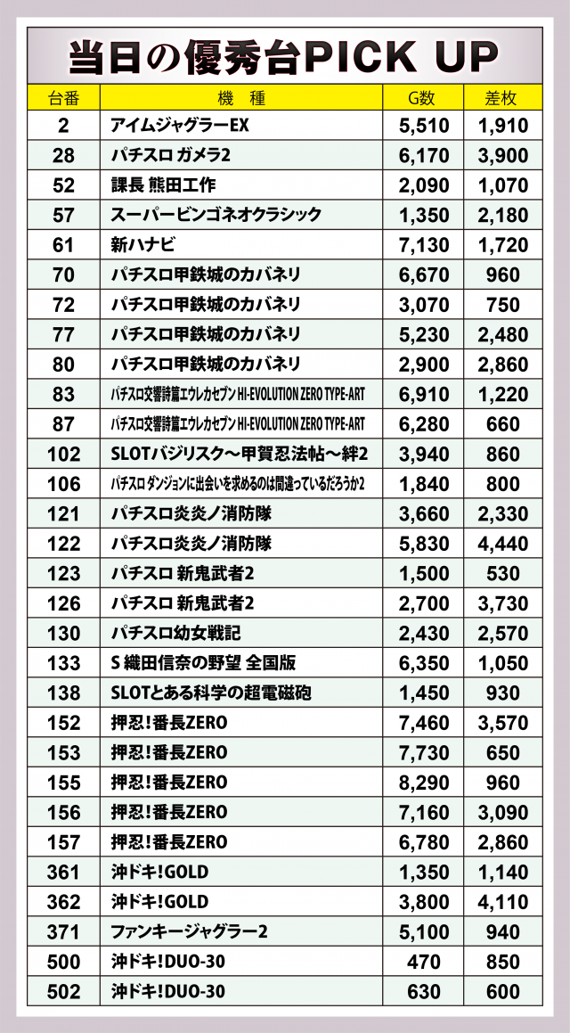 ここからは、当日の出玉データから優秀台の詳細に迫っていく。