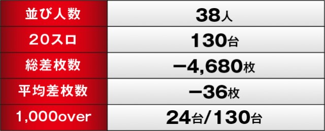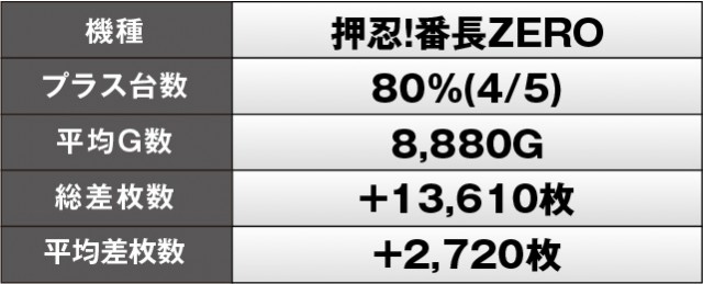 スマスロでシリーズ最新作が登場したとはいえ、『押忍!番長ZERO』はまだまだ現役と言えるだろう。平均ゲーム数8,880Gと閉店まで打ち込まれた状況となっており、総差枚数も+13,610枚と熱気が噴出した。勝率80%と高い数字をマークしており、同店が同機種に対して、如何に力を入れていたのかが分かる内容だ。