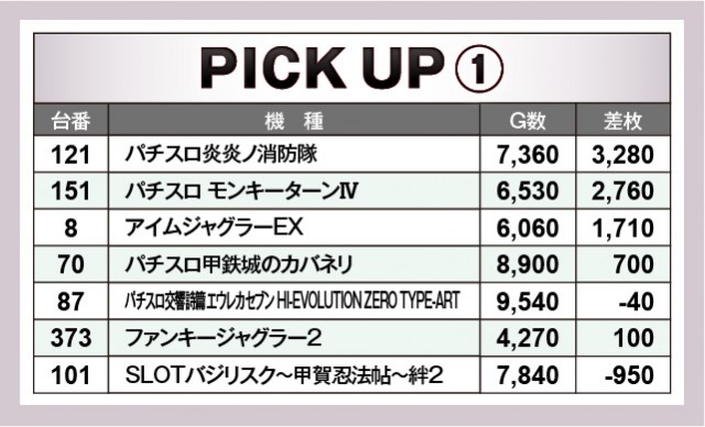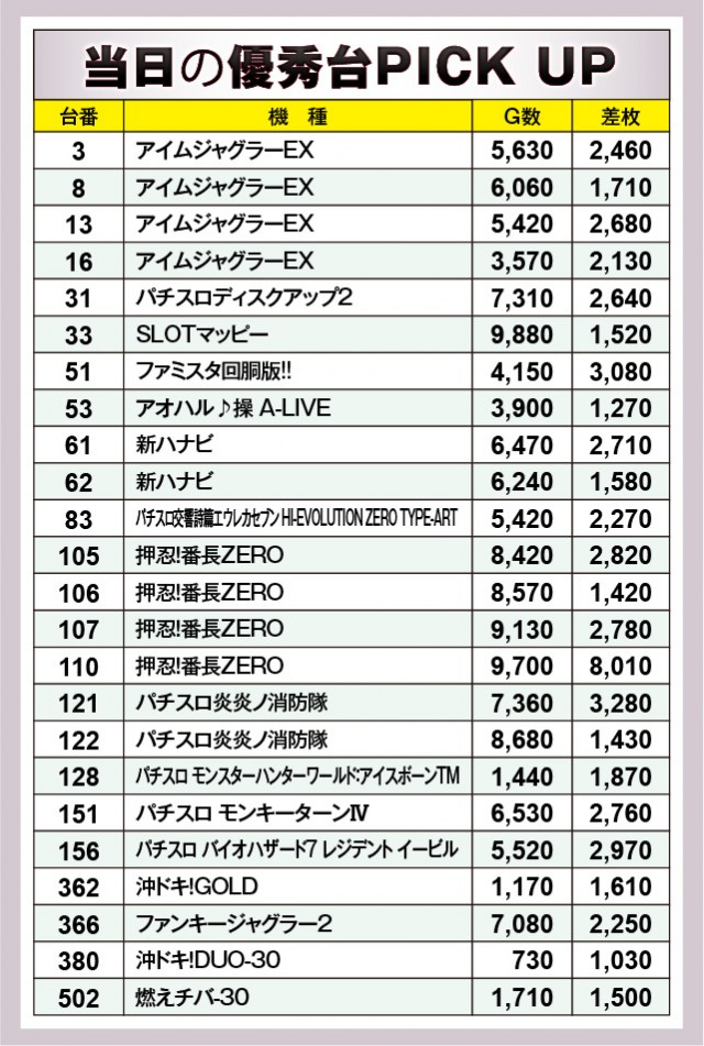 各所で盛り上がりを披露していた印象だが、同時にそれは可能性が秘めていたということである。上表の5台以上設置機種はその事実が窺える状況となっており、いずれもしっかりと結果を残していたのが鮮烈だ。人気機種だけでなく『ジャグラー』シリーズも同様で、多くのファンが笑顔を覗かせた1日になったのではないだろうか。