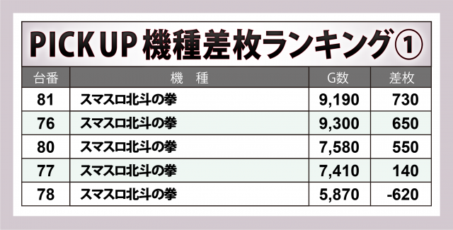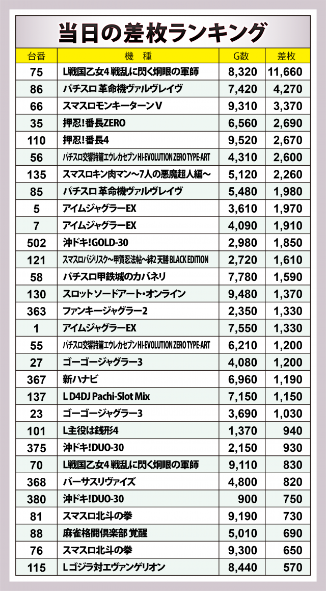 まずは上位30台をチェック。30台のうち21台が+1,000枚以上を達成し、+2,000枚以上は7台、+3,000枚以上は3台、+4,000枚オーバーは2台、そして万枚をクリアしたのは1台となった。