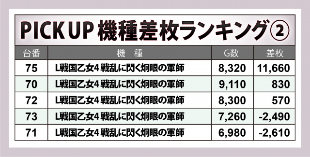 中でも『L戦国乙女4 戦乱に閃く炯眼の軍師』75番台が全台の頂点に輝いたが、その他はもうひと声が欲しい状況だった。