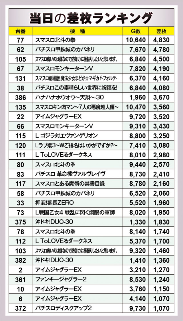 ※差枚数順に掲載しています。