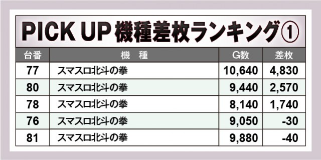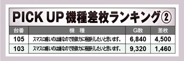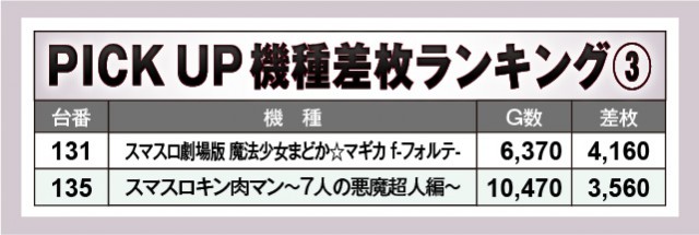 『スマスロ北斗の拳』は終日を通して活気が衰えず、さらには半数以上の台でプラス差枚数を達成している。しかもマイナス差枚は誤差と言える範囲で、好パフォーマンスを披露。また『スマスロ痛いのは嫌なので防御力に極振りしたいと思います。』も全台プラス差枚数を記録し、『スマスロ劇場版 魔法少女まどか☆マギカ[前編]始まりの物語/[後編]永遠の物語f-フォルテ-』『スマスロキン肉マン~7人の悪魔超人編~』も高い熱量を放ち、盛り上がりに貢献していた。