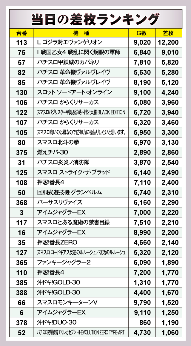『L ゴジラ対エヴァンゲリオン』にて万枚OVERが発生しこの日のトップを飾れば、さらに『L戦国乙女4 戦乱に閃く炯眼の軍師』が9,000枚OVERで続くなど、ホール内は凄まじい熱気が包み込んでいた。このほかにもまとまった出玉を獲得する台を確認でき、遊技していたファンはかなりの満足度を得ていただろう。