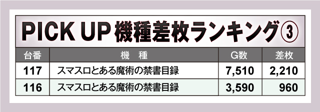上記のほか、『押忍!番長4』『パチスロ からくりサーカス』『スマスロとある魔術の禁書目録』といった人気機種からも優秀な記録を確認でき、ホール中で終日を盛り上がりを見せていたことは言うまでもなく、さまざまな機種にチャンスが潜んでいたこともうかがえる。
