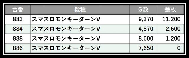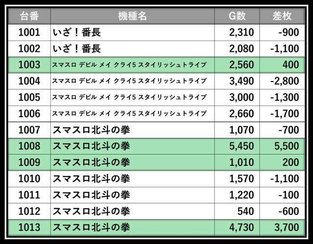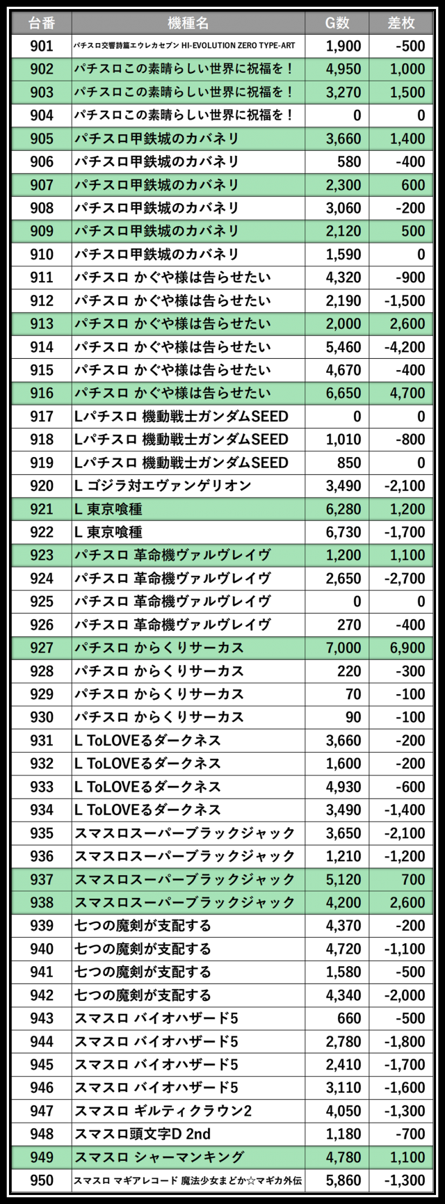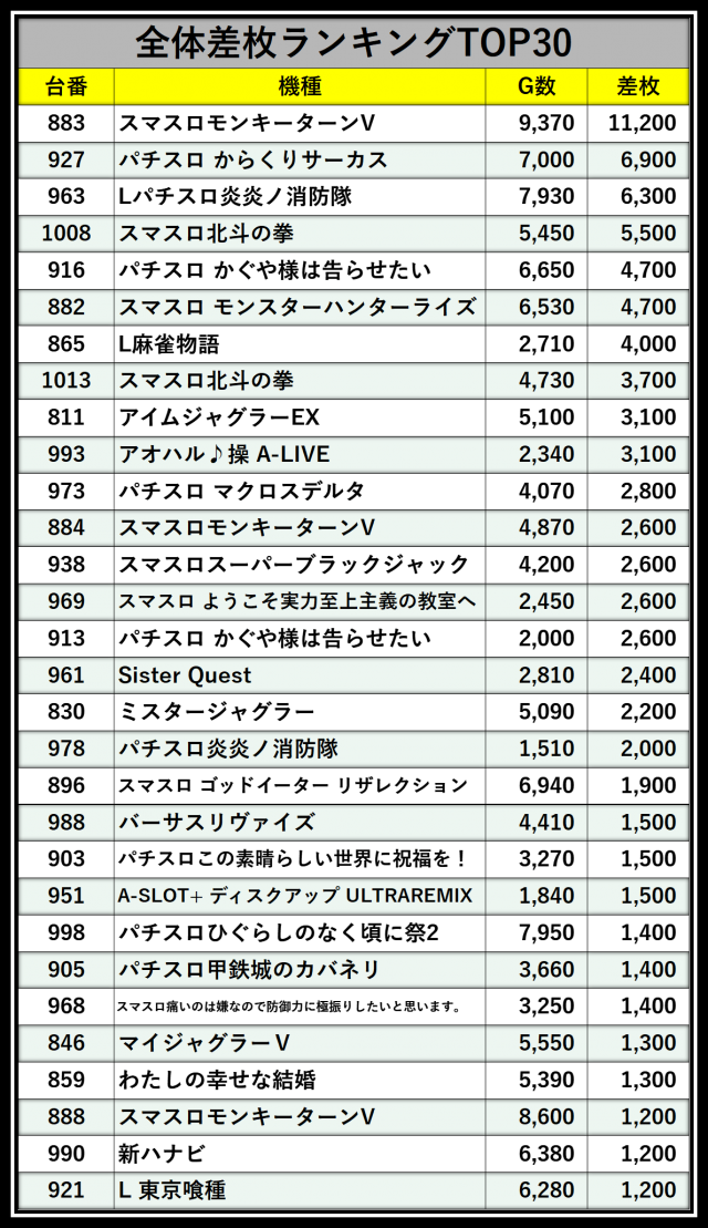 ※差枚数順に掲載しています
