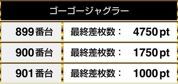 おなじく、人気を集めていた『ゴーゴージャグラー』は4750ptを含めて3台が連なってプラスptを記録した。