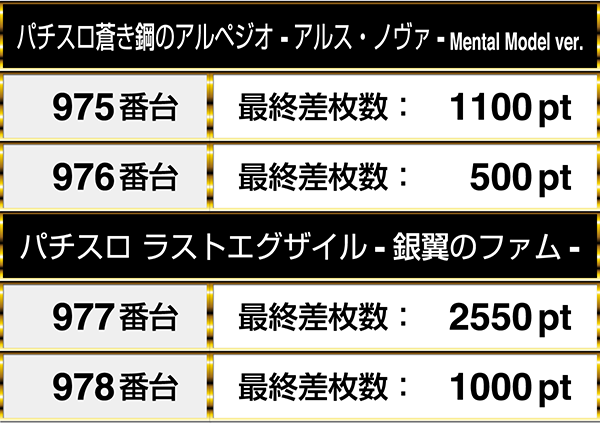 『パチスロ蒼き鋼のアルペジオ -アルス・ノヴァ- Mental Model ver.』と『パチスロ ラストエグザイル-銀翼のファム-』の975番台から978番台までが連なってプラスpt!