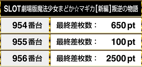2000ptオーバーの台があった『SLOT劇場版魔法少女まどか☆マギカ[新編]叛逆の物語』は3台が並んでプラスptを記録!!
