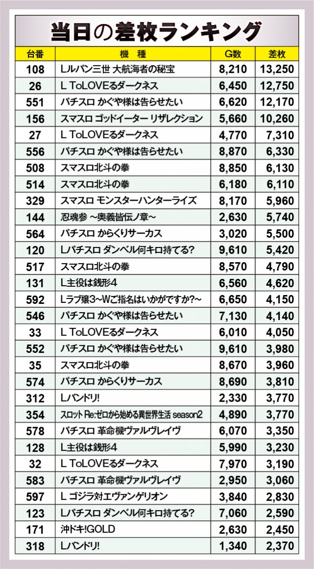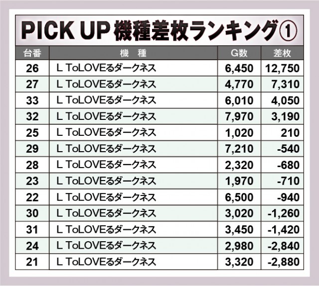 『L ToLOVEるダークネス』は優秀機種として店内の盛り上がり貢献していた。万枚OVERを筆頭に7,000枚OVERといった大台突破台や、じっくりと打ち込まれた形跡が見られ、遊技していたファンは手応えを感じられたのではないだろうか。また大きなマイナスも少なくなっており、より回転数が大きくなれば、大きな熱気を放っていたに違いない。
