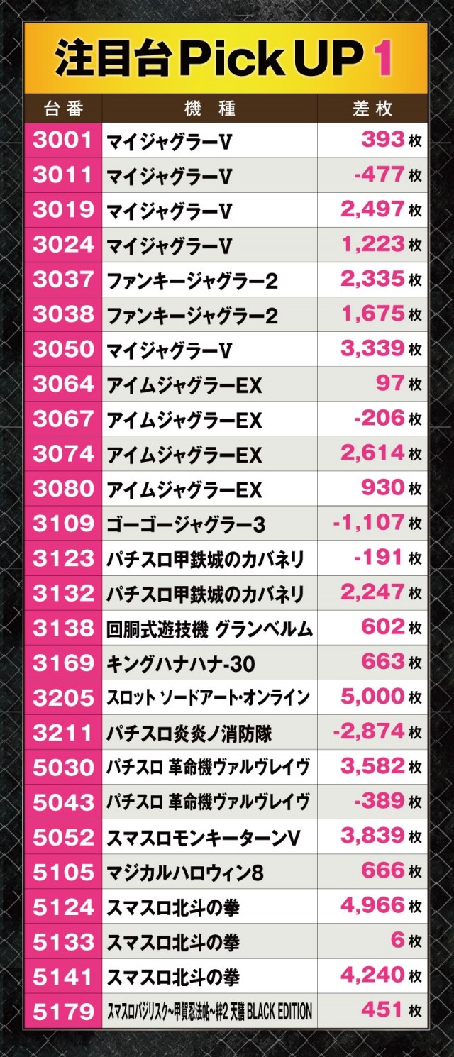 さらにジャグラーシリーズからは12台の好調台が誕生しており、平均+1,109枚とこちらも大盛り上がりとなっていた。