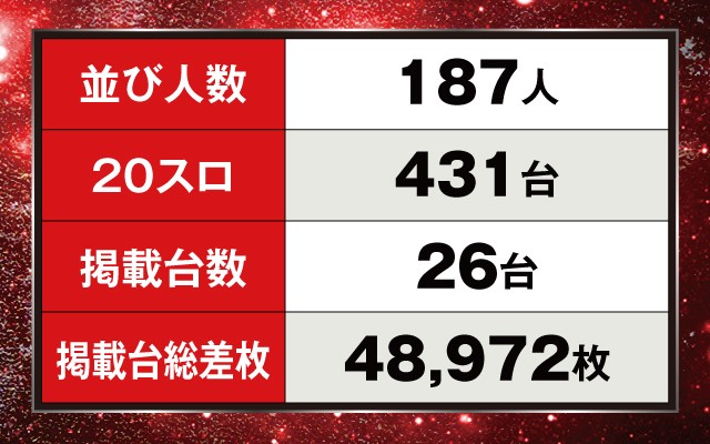 初降臨となる今回の店内を見てみると、機種を問わず好調台が誕生しており、平均+1,884枚の大盛況となっていた!
