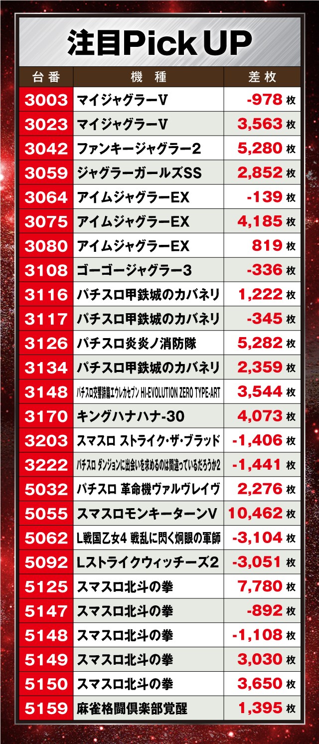 さらに『ファンキージャグラー2』や『パチスロ炎炎ノ消防隊』も5,000枚オーバーと、機種のポテンシャルをいかんなく発揮できていた。