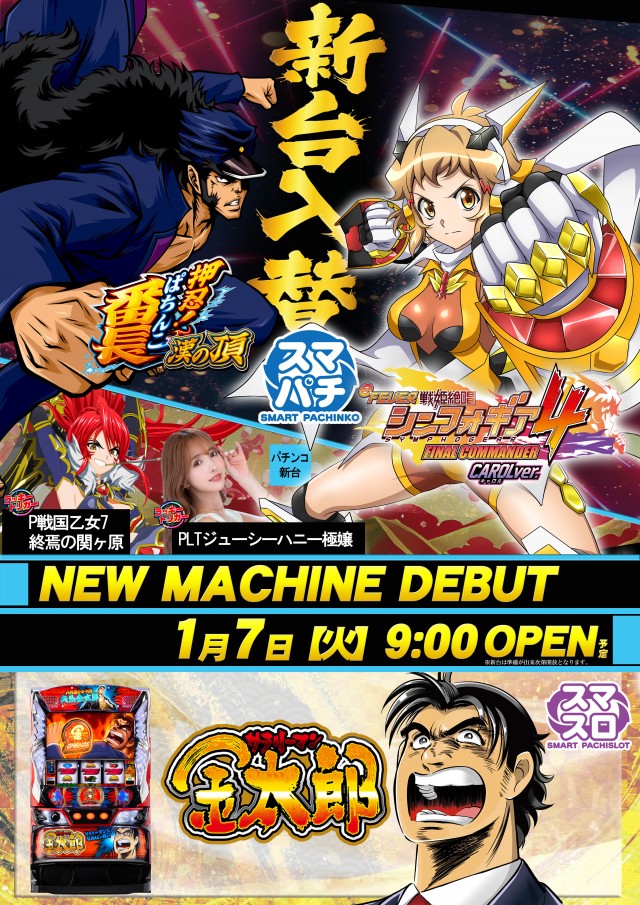 本日は新台入替です!eシンフォギア4、スマスロ金太郎他登場!