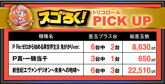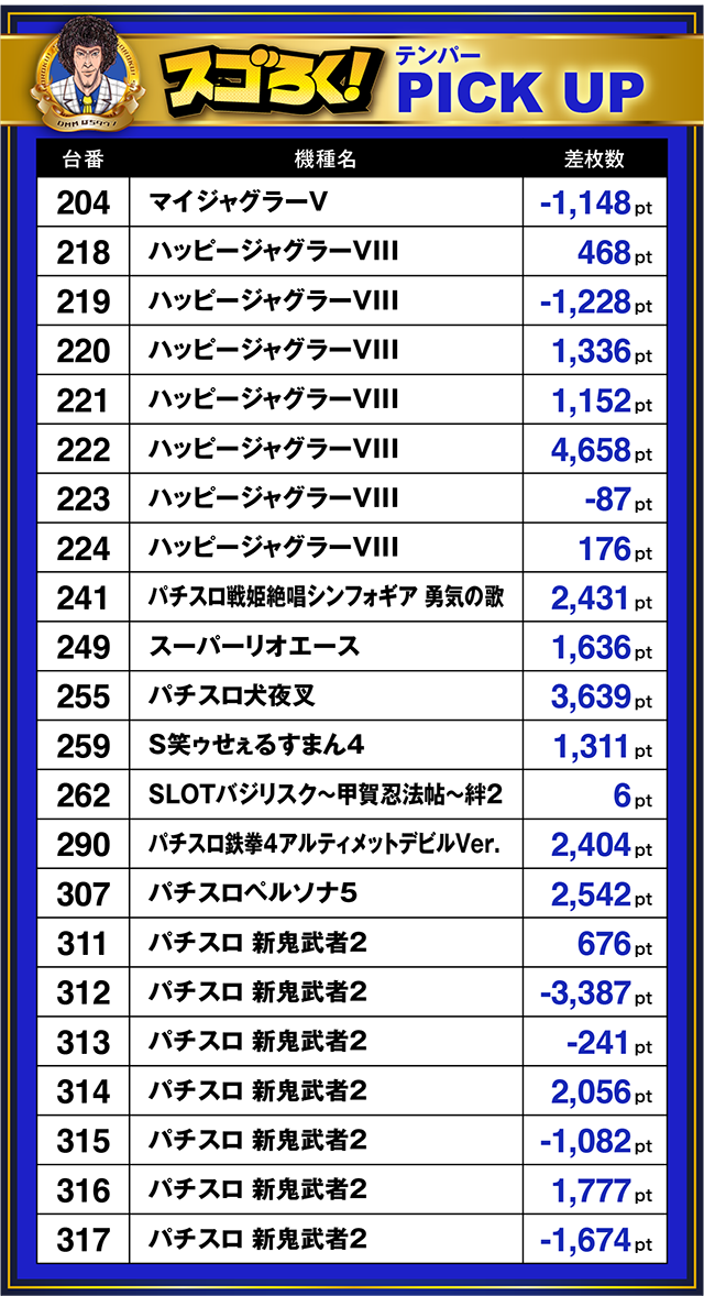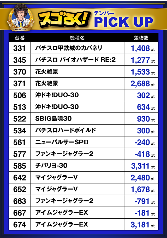 255番台の「パチスロ犬夜叉」と585番台の「チバリヨ-30」も、3,000pt以上! プレイヤーたちは心から遊技を楽しめたみたいだな。