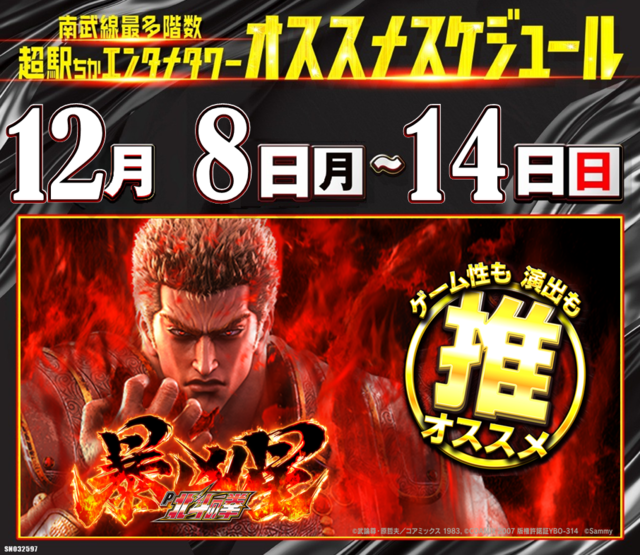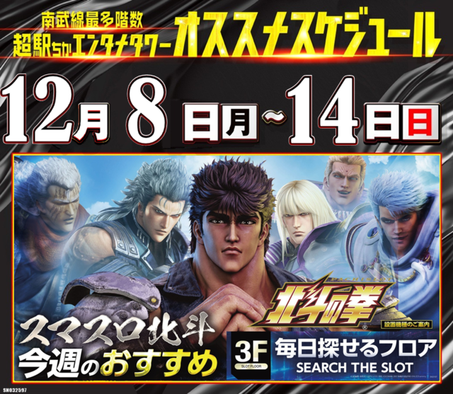 12月も止まらない!スロット増台264台へ!パチンコ話題の最新台北斗暴凶星導入!初代暴凶星と共に大切にして参ります!アズールレーン他8機種15台導入!