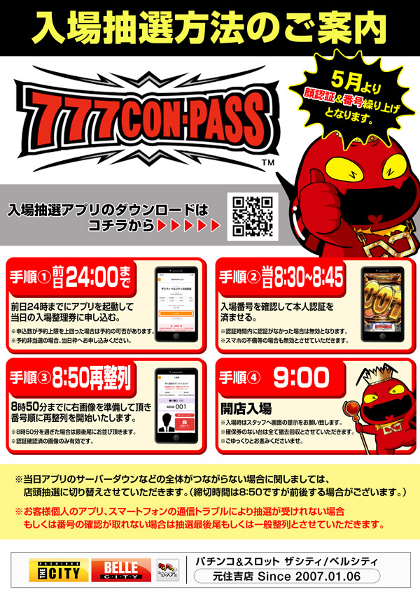 パチンコ:並び順にて午前8時30分~整理券配布 8時50分駐輪場にて再整列 スロット:777CON-PASSアプリで当店の予約を行い8時30分抽選 8時50分駐輪場にて再整列 |