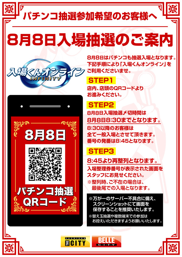 パチンコ:並び順にて午前8時30分~整理券配布 8時50分駐輪場にて再整列 スロット:777CON-PASSアプリで当店の予約を行い8時30分抽選 8時50分駐輪場にて再整列 |
