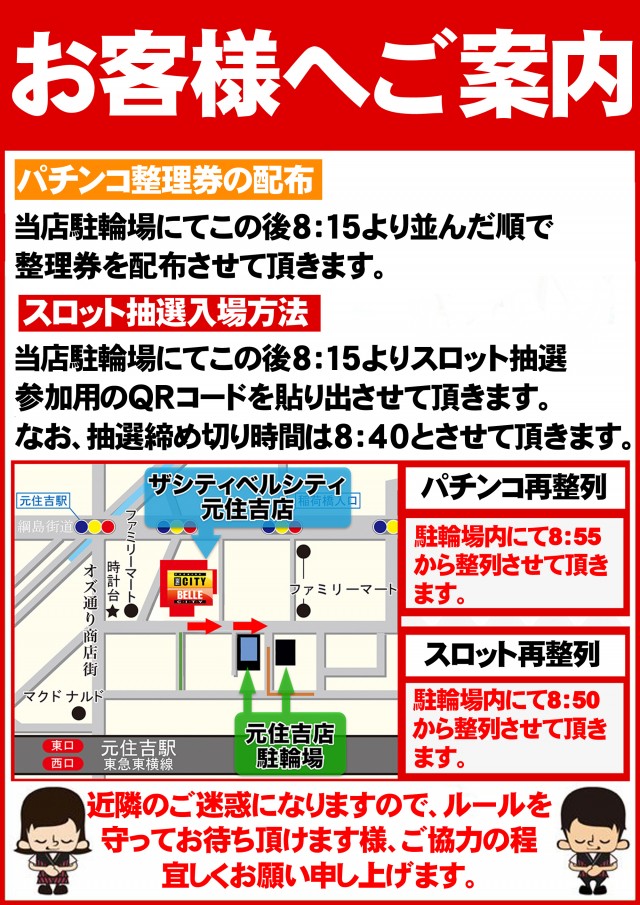 パチンコ:並び順にて午前8時30分~整理券配布 8時50分駐輪場にて再整列 スロット:777CON-PASSアプリで当店の予約を行い8時30分抽選 8時50分駐輪場にて再整列 |