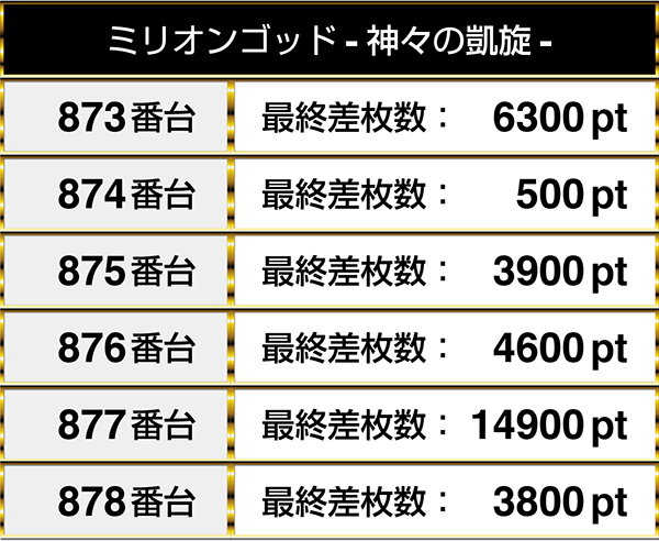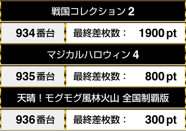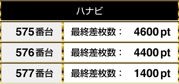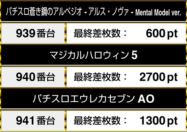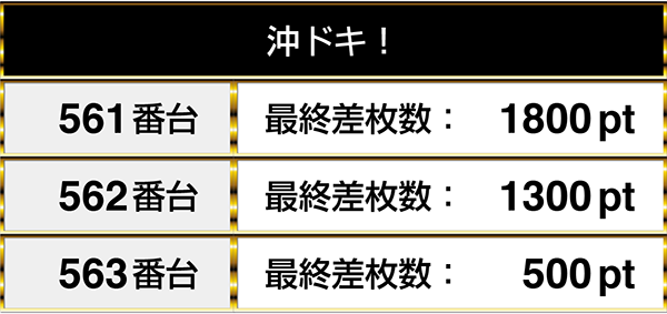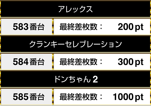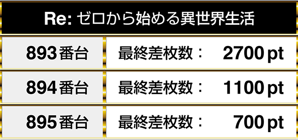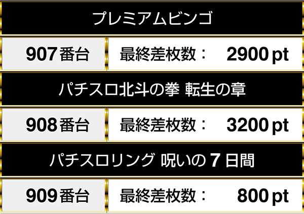 『パチスロ北斗の拳 転生の章』や『パチスロリング 呪いの7日間』など、複数の機種を通して並びでプラスptとなる場所が3箇所あった。