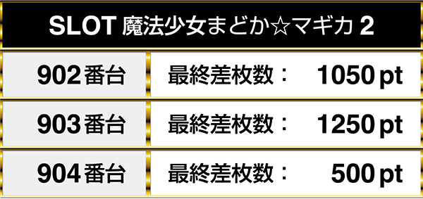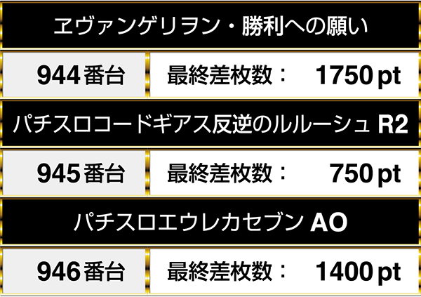 944番台の『ヱヴァンゲリヲン・勝利への願い』から946番台の『パチスロエウレカセブンAO』までの3台が並んでプラスptを記録!