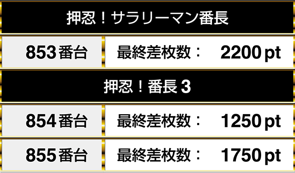 2200ptを記録した『押忍!サラリーマン番長』の1台が『押忍!番長3』の2台と連なってプラスpt!