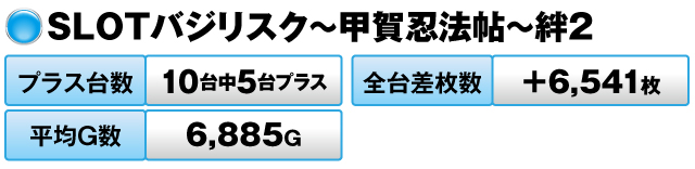 その他では、『SLOTバジリスク〜甲賀忍法帖〜絆2』が好調で、10台中5台がプラスで全台差枚数は+6,541枚をマークした。