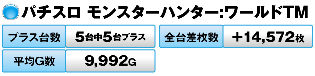 5台すべてがプラスで全台差枚数は+14,572枚、平均G数は9.992Gにも及んだ。