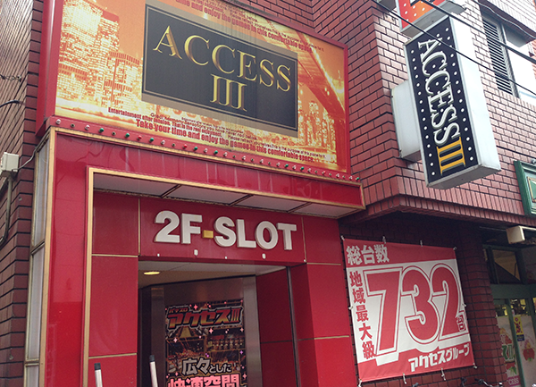 今回の取材のメインとなったのはパチスロ専門店の「アクセスⅢ」で、パチンコ専門店の「アクセスⅠ」と低貸し玉専門店の「アクセスⅡ」が隣接している。
