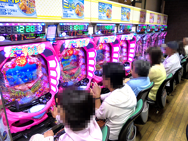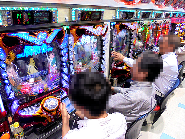 14時頃の4円パチンココーナーをうかがうと、「パチンコCR偽物語 299Ver.」や「CRフィーバー戦姫絶唱シンフォギア」などが盛り上がっており、理想的な展開にプレイヤーからは笑顔があふれていた。