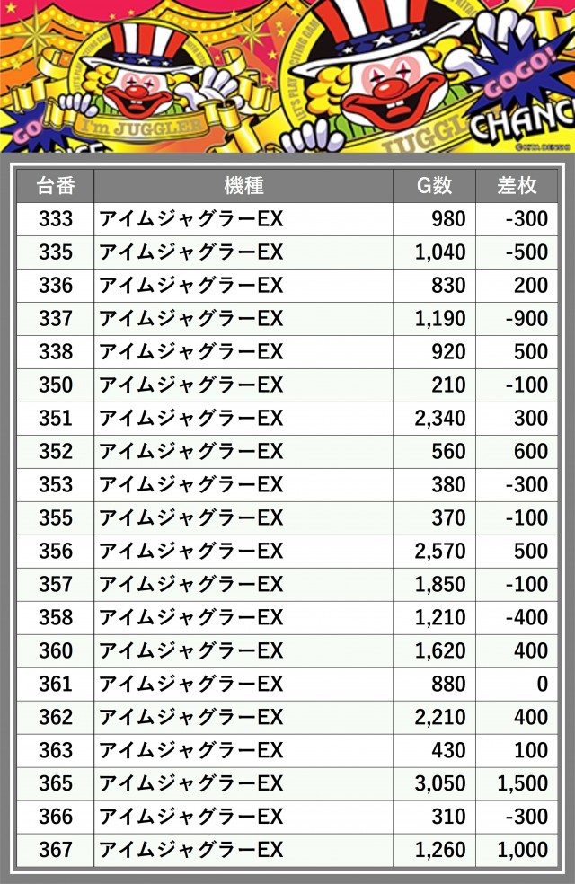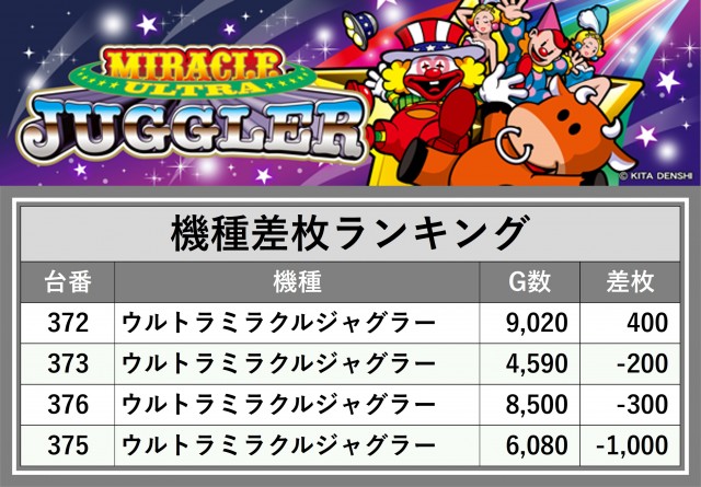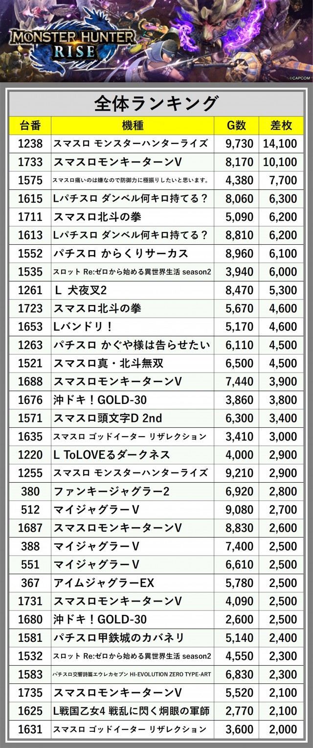 厳選された取材対象機種をはじめ、その他スロット全体から好記録が飛び出した!プレイヤーが楽しんだ1日を下記データにて振り返ってみて欲しい。