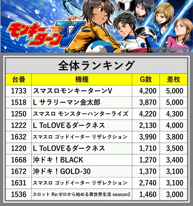 厳選された取材対象機種をはじめ、その他スロット全体から好記録が飛び出した!プレイヤーが楽しんだ1日を下記データにて振り返ってみて欲しい。