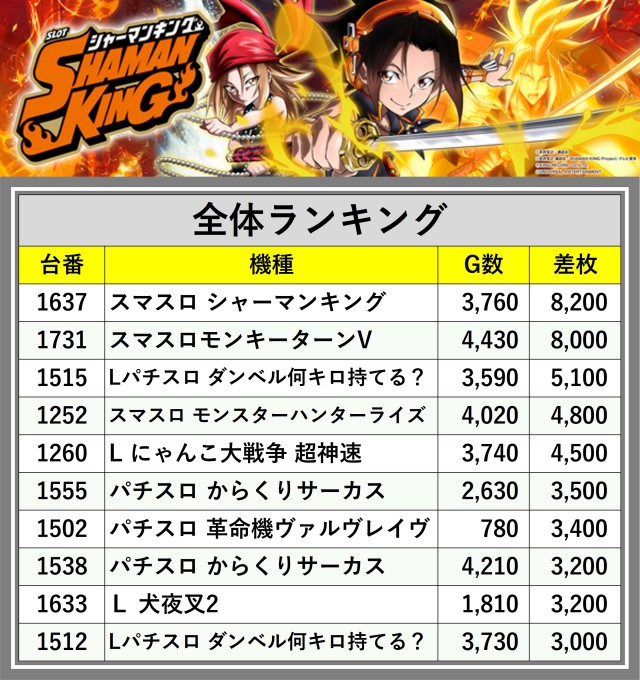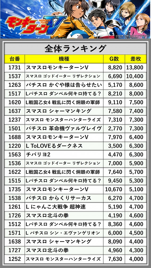 厳選された取材対象機種をはじめ、その他スロット全体から好記録が飛び出した!プレイヤーが楽しんだ1日を下記データにて振り返ってみて欲しい。