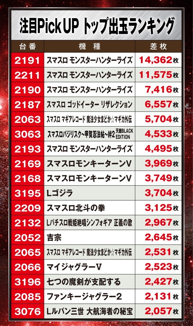 また、その他の機種では『スマスロ ゴッドイーター リザレクション』で+6,557枚、『スマスロ マギアレコード 魔法少女まどか☆マギカ外伝』で+5,704枚など、人気のスマスロを中心に様々な機種でハイスコアが続出。広範囲に渡ってチャンスが潜んでいたのは間違いないだろう。