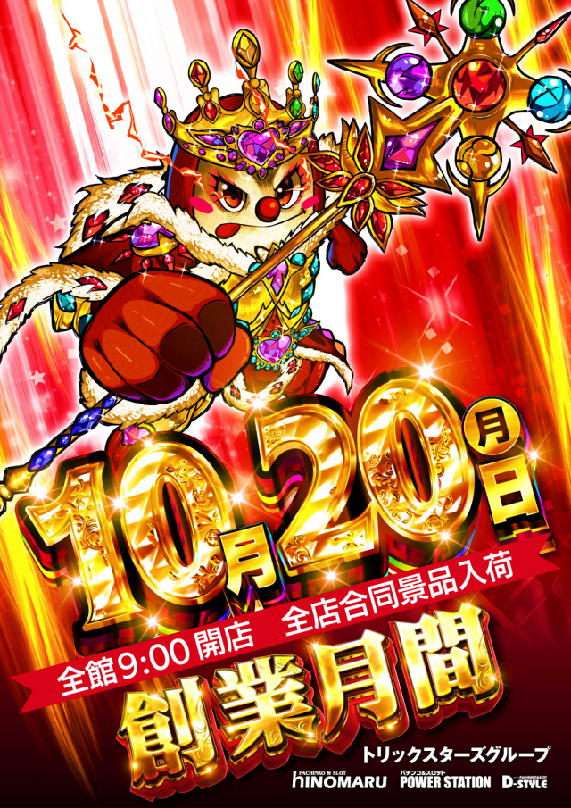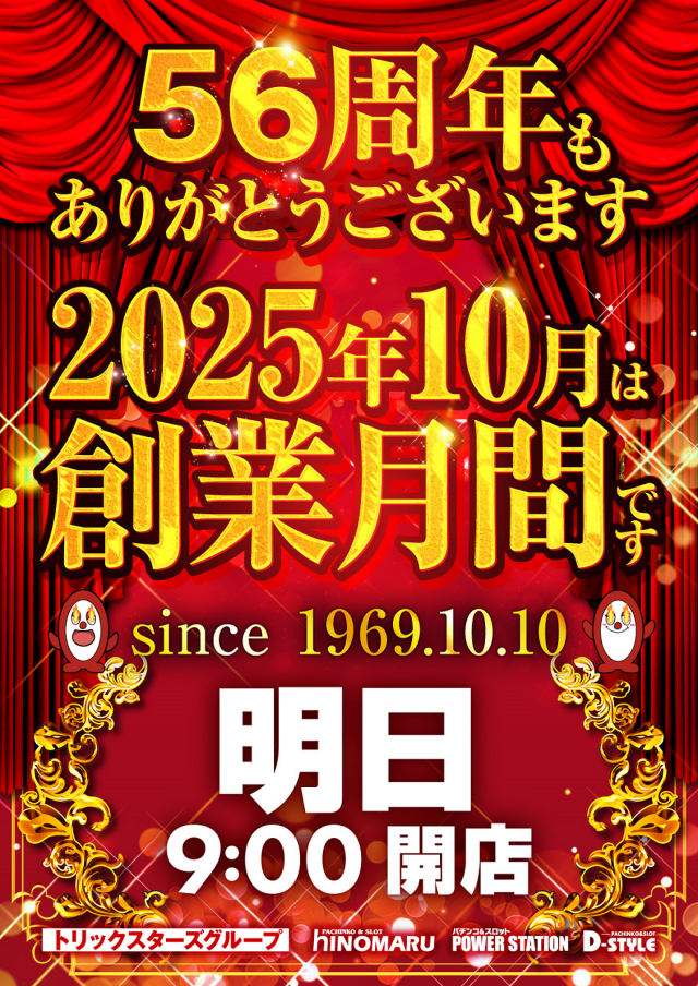 2025年10月10日でトリックスターズ・グループは創業56周年を迎えます。みなさまの日頃のご愛顧に心から感謝申し上げますm(__)m10月は向ヶ丘遊園店も新鬼武者3導入などなど楽しい企画満載で盛り上げていきます♪ -