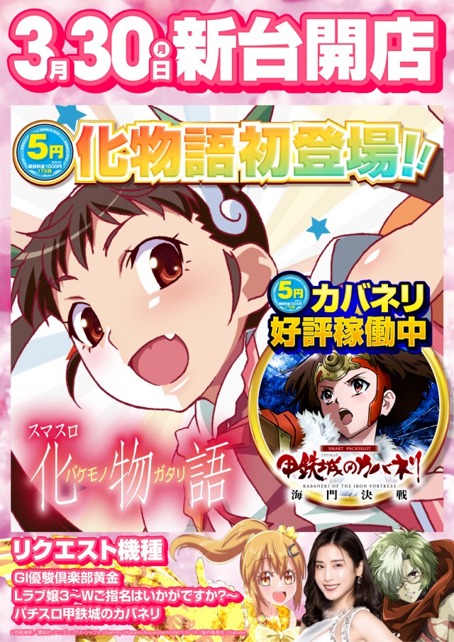 ☆明日3月30日(月)☆★全館9時OPEN 総台数【306台】★更に新台開店!5スロでL化物語が遊べる⁉