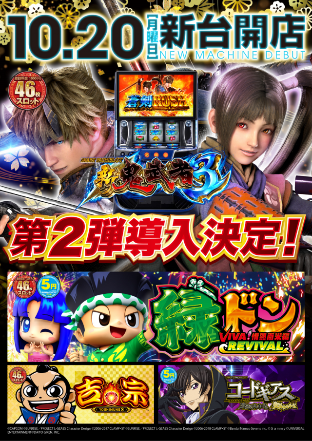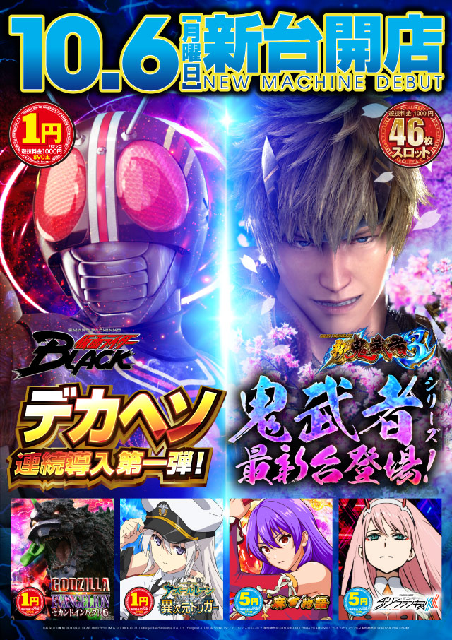 創業月間第1回目の新台開店はスマスロ新鬼武者3など一挙6機種導入(^^♪新台は許可が下り次第抽選開放です!詳細は店内にてご確認くださいm(__)m -