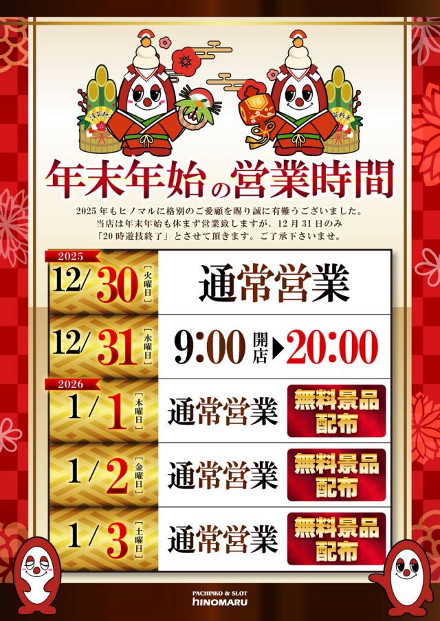 抽選時間は8時45分から!開店時間は9時開店!!2025年最後の30日もヒノマルでお待ちしています(^^♪ -