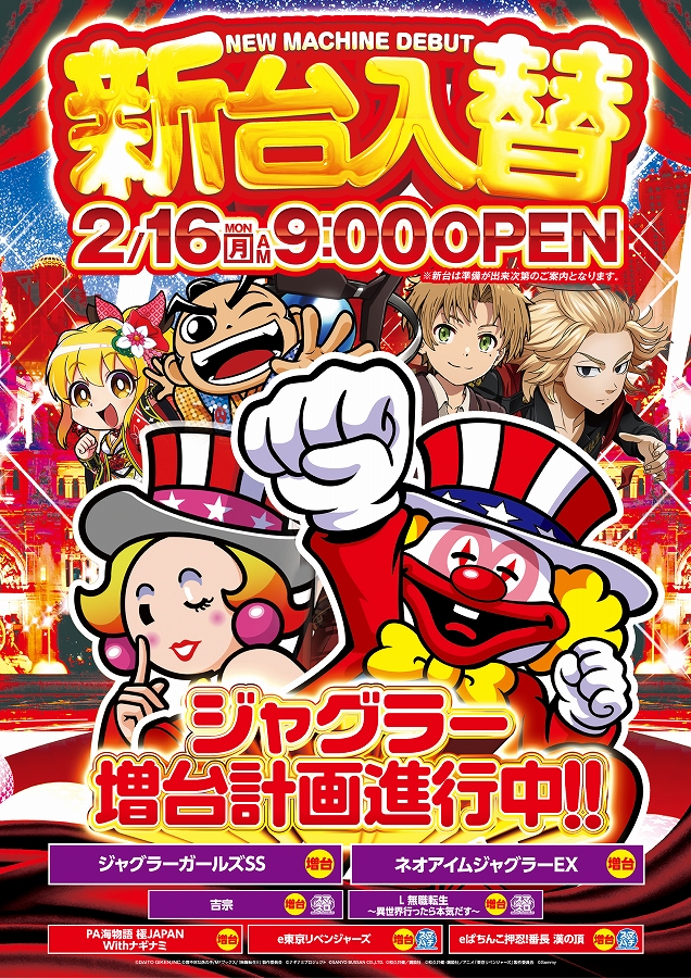 2/16【新台入替】9時開店☆人気機種増台&大海5オススメ☆