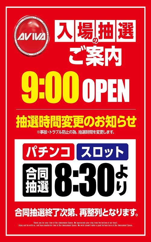 8時45分に店舗横駐車場側入り口にて抽選を行います。 |