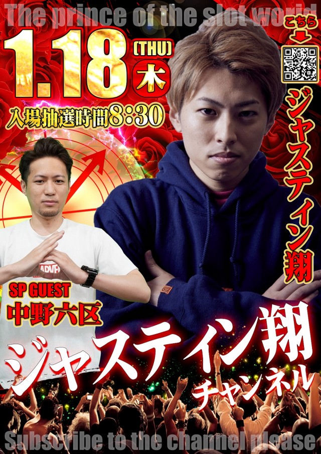 明日18日🌈ジャスティン翔チャンネル来店予定🌈抽選8:30~