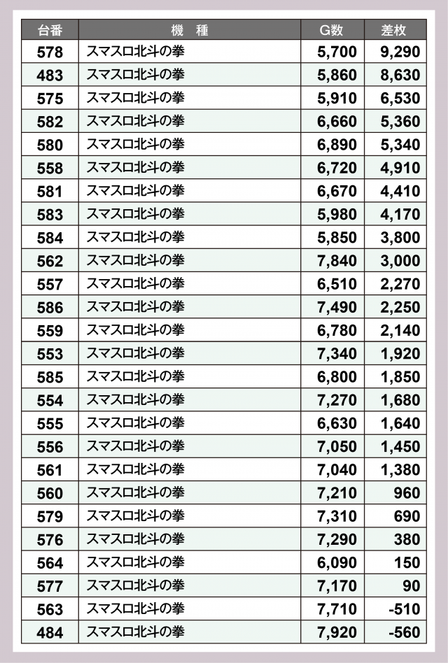 この日大きな盛り上がりを見せたのがパチスロコーナー。『スマスロ北斗の拳』は圧倒的な勝率を誇り、578番台の+9,300枚弱を筆頭に+5,000枚オーバーが合わせて5台と、重量級の出玉が並んだ。